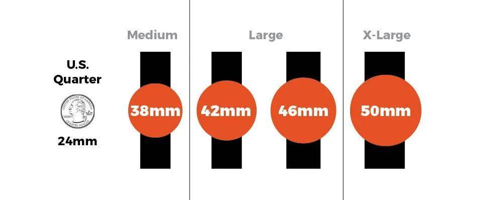 (به عنوان یک قاعده‌‌ی کلی، اندازه‌‌ی قاب ساعت متوسط کمتر از 42 میلی‌متر، اندازه‌‌ی قاب بزرگ بین 42 میلی‌متر و 49 میلی‌متر و قاب خیلی بزرگ 50 میلی‌متر و بیشتر است.)