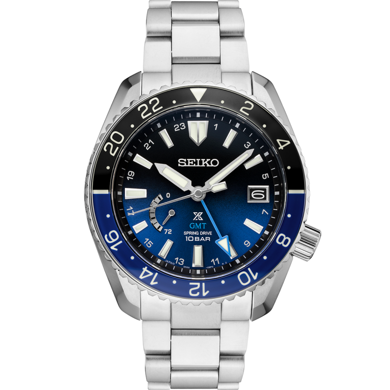 حالا بیایید به سراغ مدل‌هایی برویم که اخیراً به کاتالوگ سیکو اضافه شده‌اند. ساعت Seiko Prospex SNR049، یک نسخه محدود ۴۰۰ عددی از جنس تیتانیوم است که به لطف پرداخت زاراتسو (Zaratsu)، فرمی چندوجهی شبیه به طراحی‌های هندسی گرند سیکو دارد. ابعاد آن روی کاغذ قطعاً ترسناک به نظر می‌رسد: قطر ۴۴.۸ میلی‌متر و ضخامت ۱۴.۷ میلی‌متر. اما مانند بسیاری از مدل‌های سیکو و گرند سیکو، روی مچ بسیار جمع‌وجورتر از چیزی است که انتظار دارید. با فاصله بین دو دسته (Lug-to-Lug) ۵۰.۹ میلی‌متر، حس یک ساعت ۴۲ میلی‌متری را به شما می‌دهد، شاید فقط کمی پهن‌تر. چیزی که فوراً در این ساعت GMT اسپرینگ درایو جلب توجه می‌کند، قاب (بزل) یاقوت کبود مشکی و آبی و صفحه مدرج آن است که از مشکی به آبی تغییر رنگ می‌دهد. این ساعت واقعاً زیبایی و کارایی مدل‌های Rolex Deep Sea James Cameron و Rolex GMT Master II “Batman” را با هم ترکیب کرده و از نظر فنی با موتور GMT اسپرینگ درایو 5R66 خود را متمایز می‌کند. این موتور ۷۲ ساعت ذخیره انرژی و یک عملکرد تنظیم اختلاف زمانی مرتبط با تقویم دارد که تجربه استفاده از GMT را به سطح بالاتری می‌برد. قیمت آن از اکثر مدل‌های سیکو بالاتر است، اما وقتی قاب تیتانیومی با پرداخت زاراتسو، قاب یاقوت کبود و موتور اسپرینگ درایو را در نظر بگیرید، این قیمت بالاتر کاملاً منطقی به نظر می‌رسد.