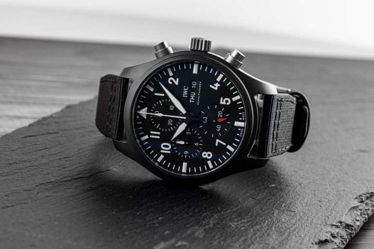 ساعت IWC Pilot Chronograph Top Gun ref. IW389101 یه ساعت سرامیکی مشکی دیگه است که علاقه شرکت ساعت‌سازی سوئیسی IWC به تکنولوژی مواد پیشرفته رو نشون میده. اعداد عربی سفید رنگ به وضوح روی صفحه مشکی ساعت 44.5 میلی‌متری دیده میشن. کرنوگراف این ساعت، صفحه‌‌های فرعی برای ثانیه، دقیقه و ساعت داره. طراحی کاربردی و نمایشگر روز و تاریخ در موقعیت ساعت سه، این مدل رو یه همراه عالی برای استفاده روزمره کرده.