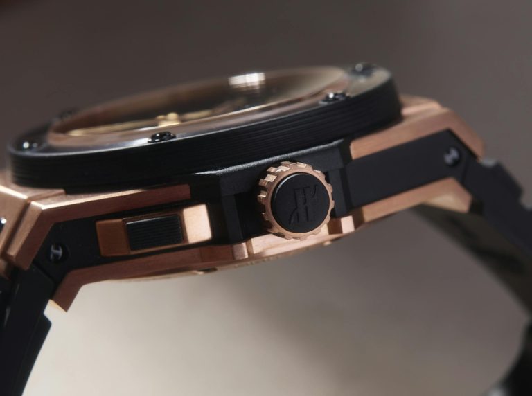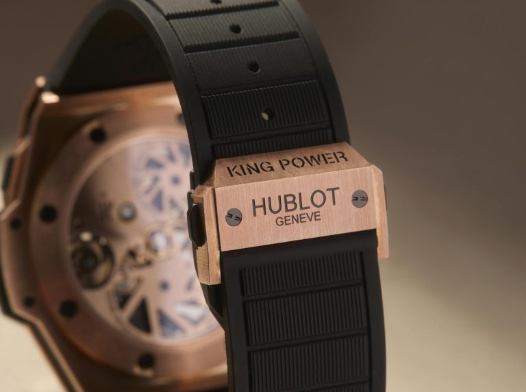 خیلی در مورد سایز بزرگ ساعت صحبت کردیم، اما اگر با اندازه‌اش مشکلی نداشته باشید، پوشیدنش روی مچ کاملاً راحت است که بخشی از این راحتی به لطف بند لاستیکی طبیعی آن است. این بند به یک قفل سگکی تاشو از جنس تیتانیوم سیاه‌شده و کینگ گلد ختم می‌شود. بند همان آج‌های روی بزل را دارد و با چهار پیچ H شکل دیگر، محکم به بدنه متصل شده است. با وجود اینکه طلای زیادی در ساعت به کار رفته، استفاده از سرامیک کمک می‌کند تا حس پوشیدن آن، کاربردی‌تر و منطقی‌تر از چیزی باشد که انتظار دارید. هرچند، باز هم باید تکرار کنیم که با یک هیولای به تمام معنا طرفیم که هیچ ابایی از به رخ کشیدن ابعادش ندارد.