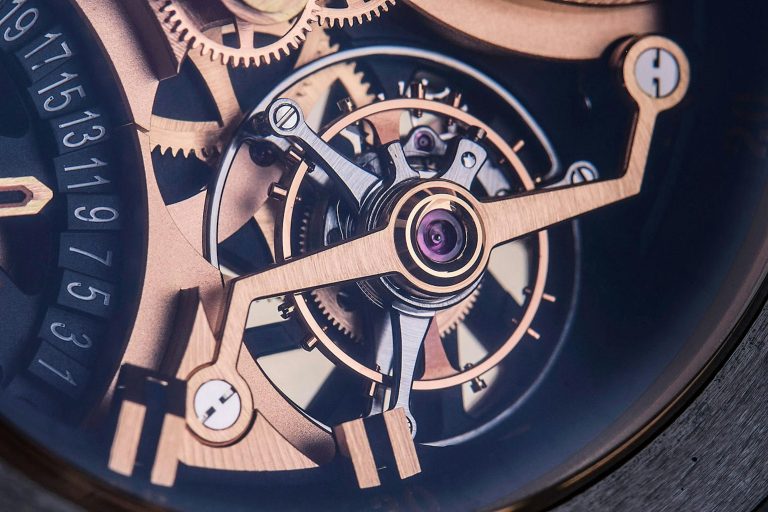 • ویژگی‌ها: توربیون یک دقیقه‌ای با فنر تعادل تخت و چرخ‌دنگ اهرمی، نمایشگر ۲۴ ساعته GMT و تاریخ بازگشتی. پوشرهای تنظیم سریع GMT و تاریخ به ترتیب در موقعیت ساعت ۴ و ۸.