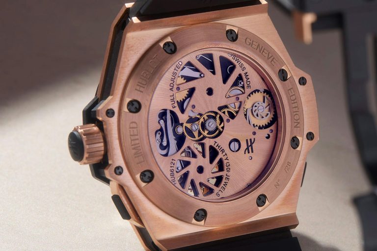 نمای پشتی ساعت به خوبی نشان می‌دهد که چطور کالیبر HUB6121 تمام فضای داخل قاب را پر کرده است. این یک چیدمان نسبتاً غیرمتعارف برای یک ساعت مدرن است.