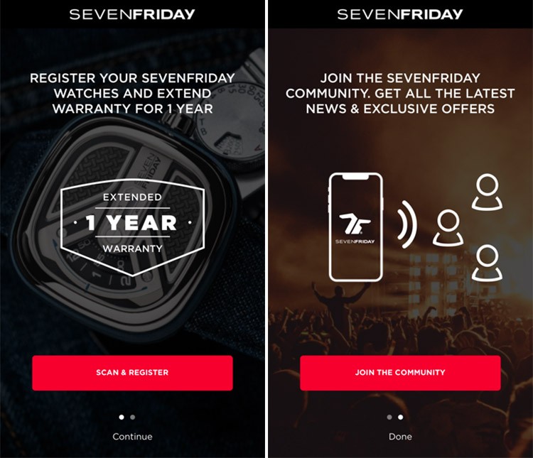اپلیکیشن SEVENFRIDAY امکان ثبت ساعت‌ها رو فراهم می‌کنه، در نتیجه دوره گارانتی رو برای یک سال اضافی تمدید می‌کنه و همچنین امکان پیوستن به جامعه برند رو میده.