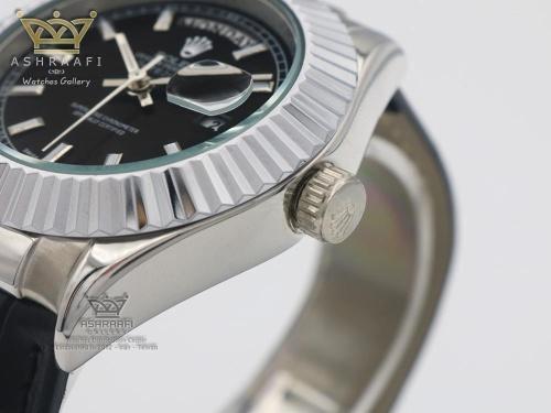رولکس Rolex DayDate BS16 یکی از مدل ‌های کلاسیک ساعت مچی می‌باشد که ترکیب قاب استیل، بند چرم و صفحه مشکی آن سادگی و جذابیت را با هم به نمایش می‌گذارد.