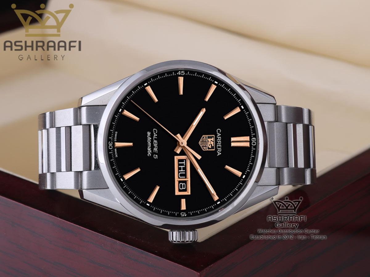 لازم به ذکر است ساعت TAG HEUER CARRERA CALIBRE 5 DAY-DATE دارای جعبه اصلی (توسط اشرافی تهیه شده) و دو ماه گارانتی اشرافی می‌باشد.
