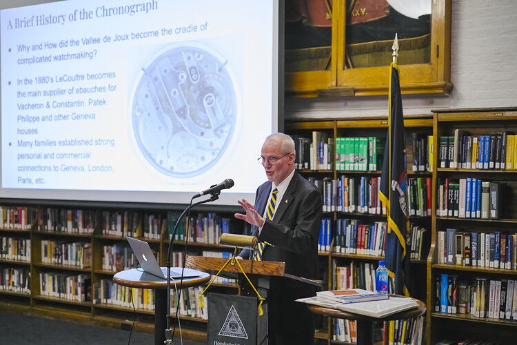 آقای برنهارد اشتوبر در حال سخنرانی برای انجمن ساعت‌شناسی نیویورک در ۶ ژانویه ۲۰۲۰.