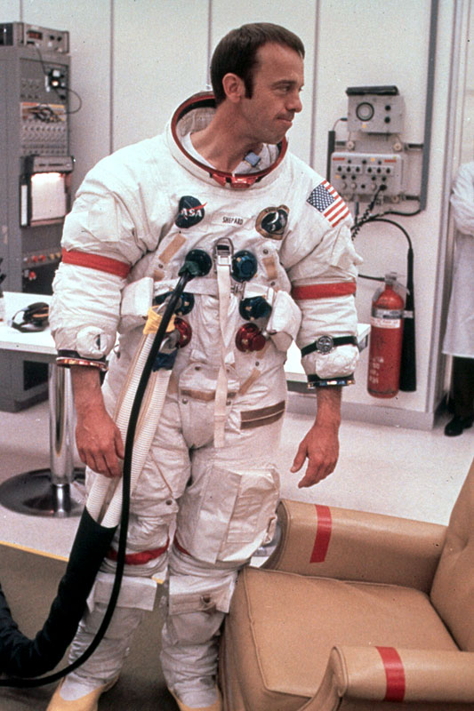 فضانورد آلن شپرد با یک ساعت امگا اسپیدمستر که با بند ولکرو (چسب پارچه‌ای) روی آستین لباس فضایی‌اش بسته شده. آقای اشتوبر اشاره کرد که ولکرو هم اصالتاً سوئیسیه.