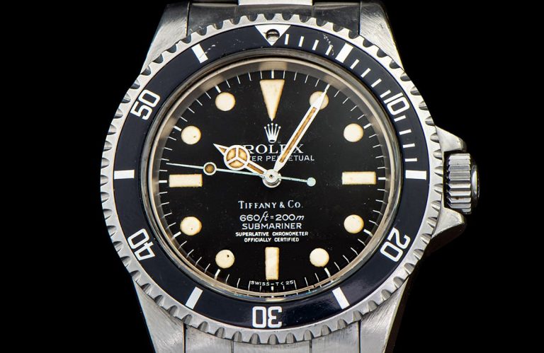 در مورد ساب‌مارینرهای با دو برند، نوشته “Tiffany & Co.” بالای اسم مدل “Submariner” اضافه می‌شد. نتیجه‌اش یه صفحه با پنج خط نوشته بالای ساعت 6 بود. همکاری رولکس و تیفانی اند کو حدود سال 1990 تموم شد. از اون موقع، تقاضا برای ساب‌مارینرهای با صفحه تیفانی حسابی رفته بالا و خیلی کمیاب و گرون شدن.